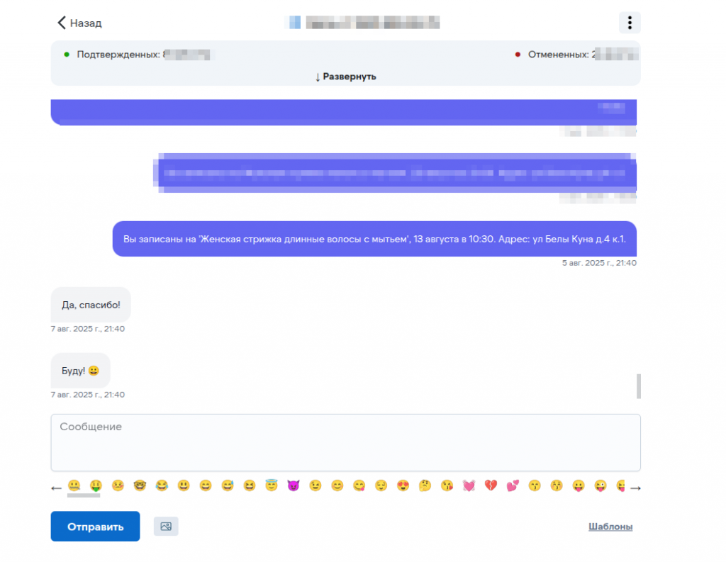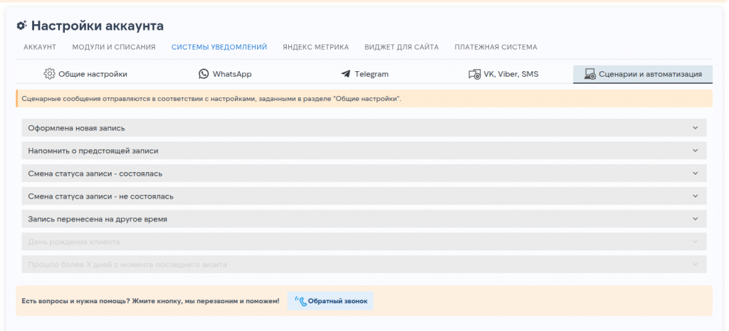 В сервисе предусмотрена интеграция с такими мессендежерами, как WhatsApp, Telegram и сообщества в VK, что позволяет в автоматическом режиме высылать клиентам напоминания о предстоящей записи, информацию о только что созданной их новой записи, запрашивать отзывы после оказанной услуги и так далее по вашему сценарному списку 🙂