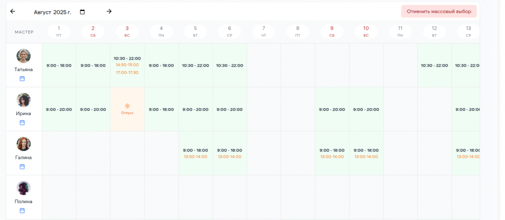 Определите рабочие и выходные дни, время работы каждого мастера, а также их перерывы.