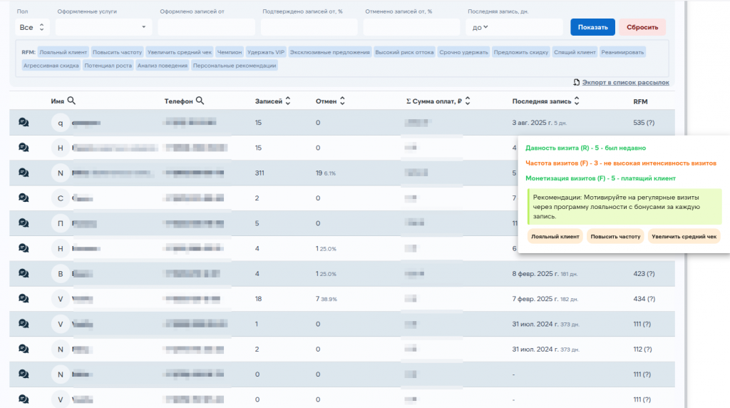 Специальный модуль позволяет анализировать лояльность клиентов, сравнивая периоды первичного обращения и повторных визитов. Это помогает выявлять наиболее эффективных мастеров и популярные услуги, а также создавать списки на рассылку именно тем клиентам и по тем услугам, на которые их вернуть больше всего шансов.