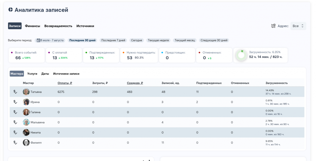 - Оптимизация загрузки мастеров и устранение простоев, если у вас салон или клиника.